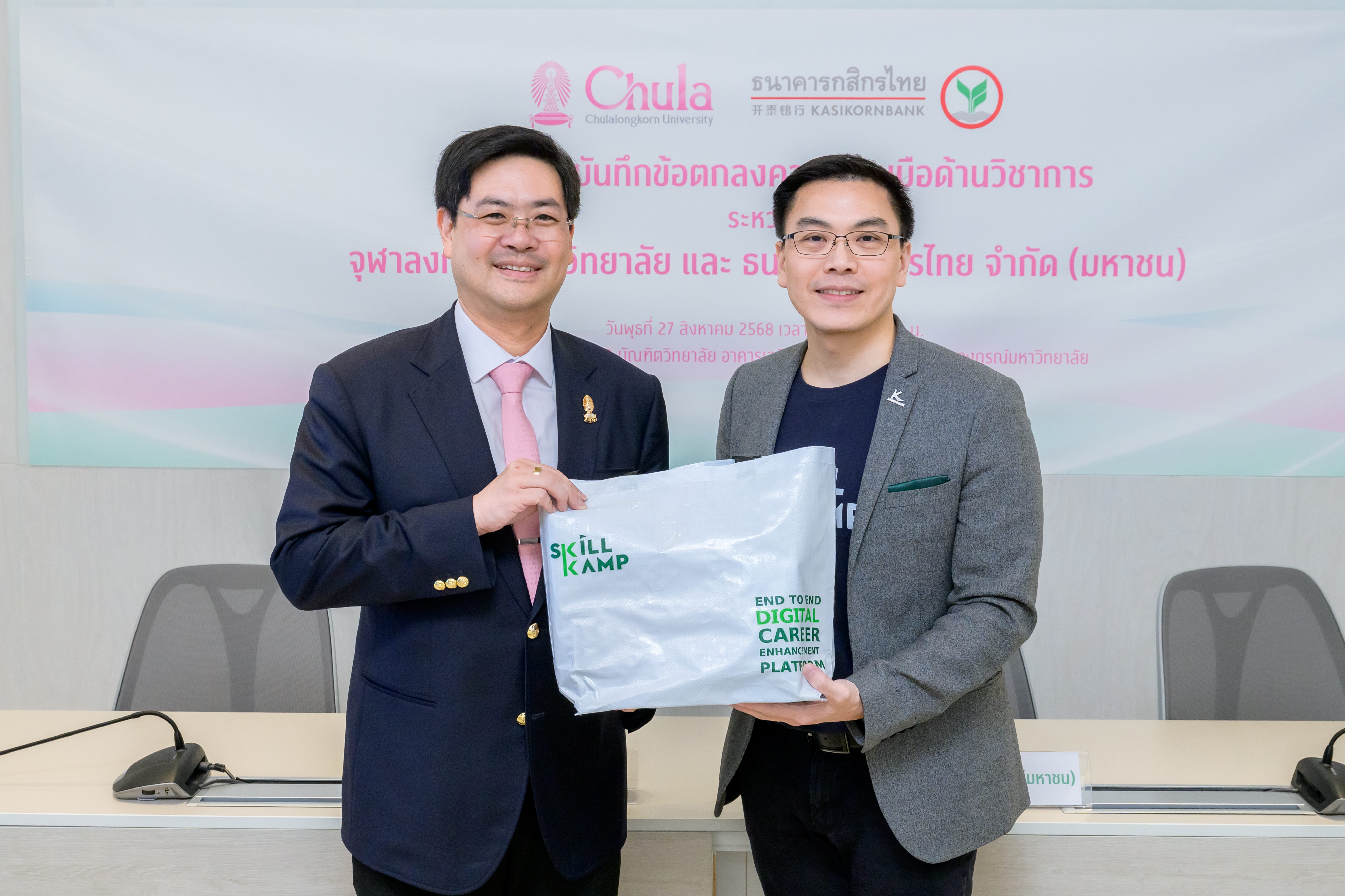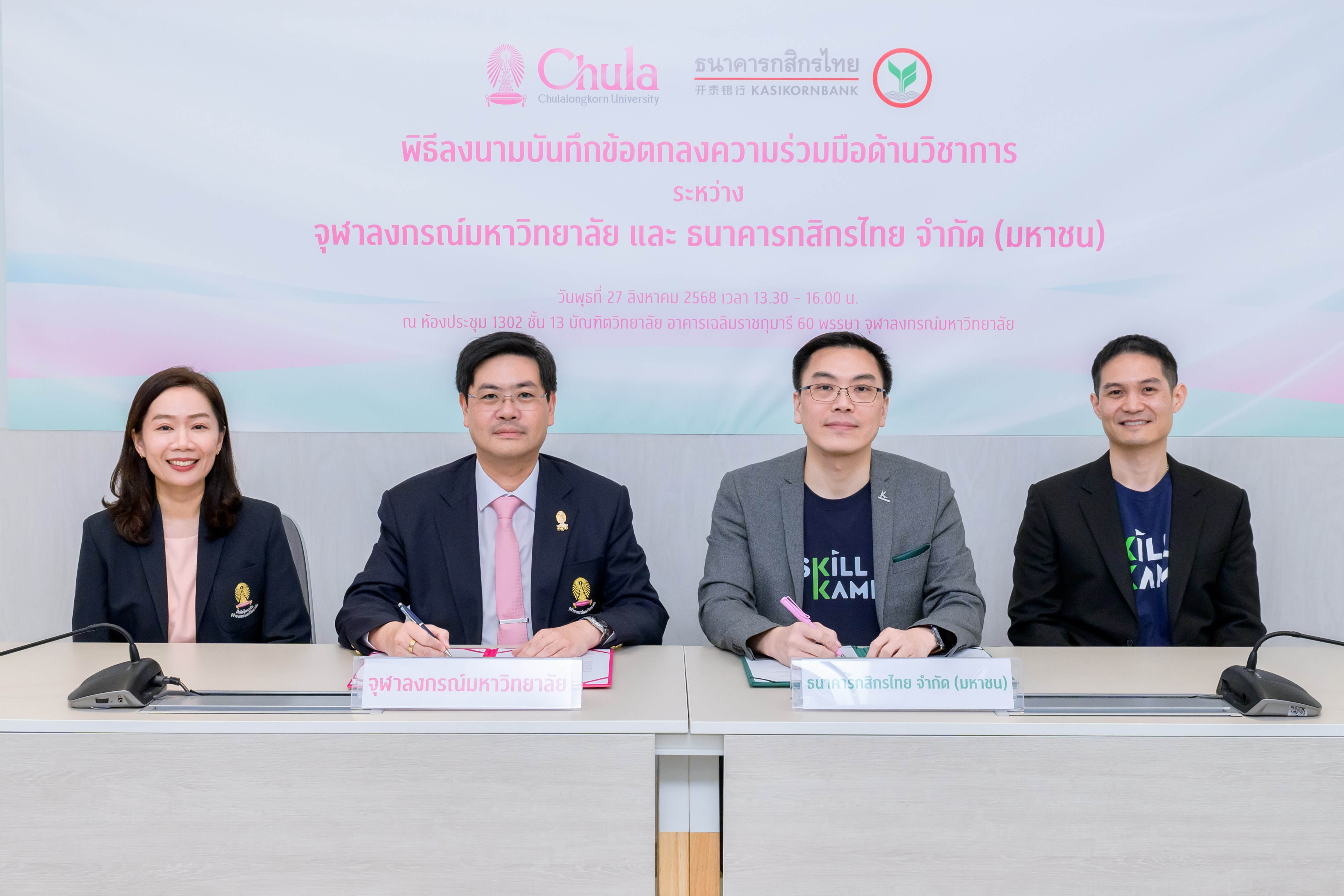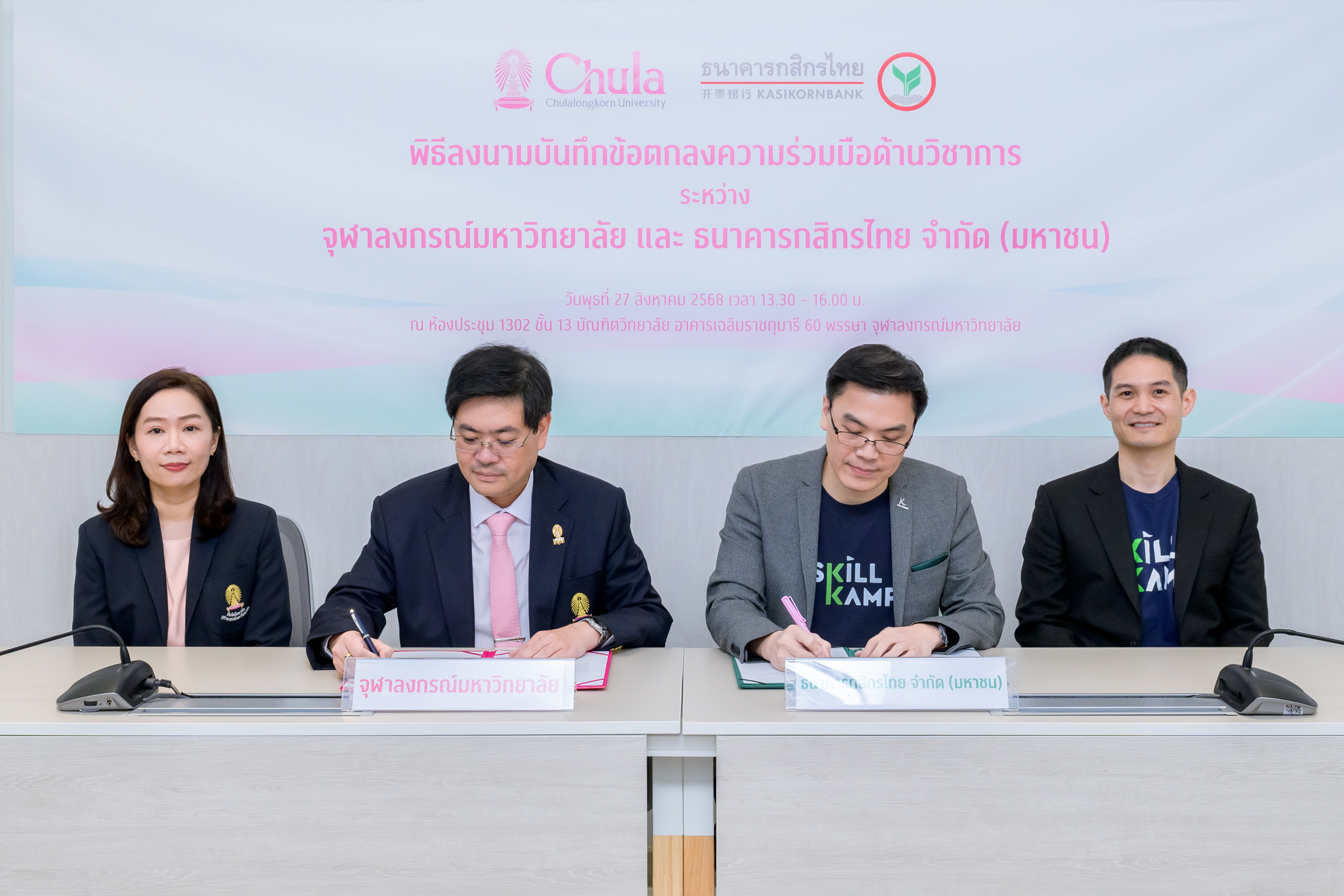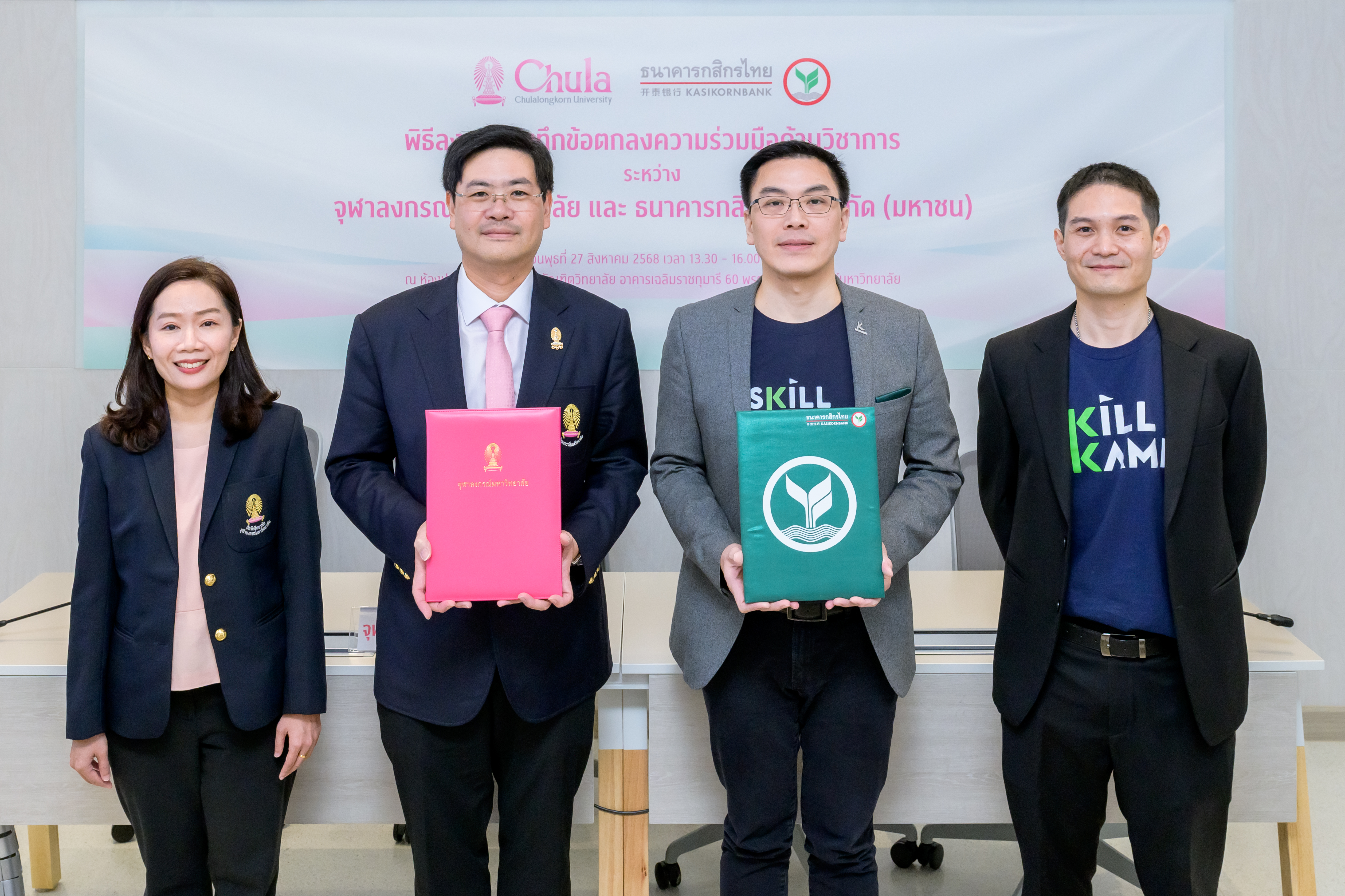 บัณฑิตวิทยาลัย จุฬาลงกรณ์มหาวิทยาลัย และธนาคารกสิกรไทย ร่วมลงนามบันทึกข้อตกลงความร่วมมือด้านวิชาการ (MOU) เชื่อมต่อแพลตฟอร์ม SKILLKAMP และ Chula Lifelong Learning (Chula X) เพื่อยกระดับศักยภาพการเรียนรู้และเปิดโอกาสให้ผู้เรียนสามารถเข้าถึงหลักสูตรคุณภาพที่อยู่บน 2 แพลตฟอร์ม รวมกว่า 1,000 รายวิชา ได้อย่างไร้รอยต่อ ครอบคลุมทั้งวิชาการและทักษะดิจิทัล รองรับการ Upskill-Reskill ทุกช่วงวัย โดยคาดหวังว่าความร่วมมือในครั้งนี้จะช่วยพัฒนาทักษะและสร้างบุคลากรที่มีศักยภาพเพิ่มมากขึ้น เพื่อร่วมกันขับเคลื่อนเศรษฐกิจไทยให้เติบโตไปได้อีก พร้อมเดินหน้าเปิดให้บริการเรียนรู้เต็มรูปแบบในปี 2569