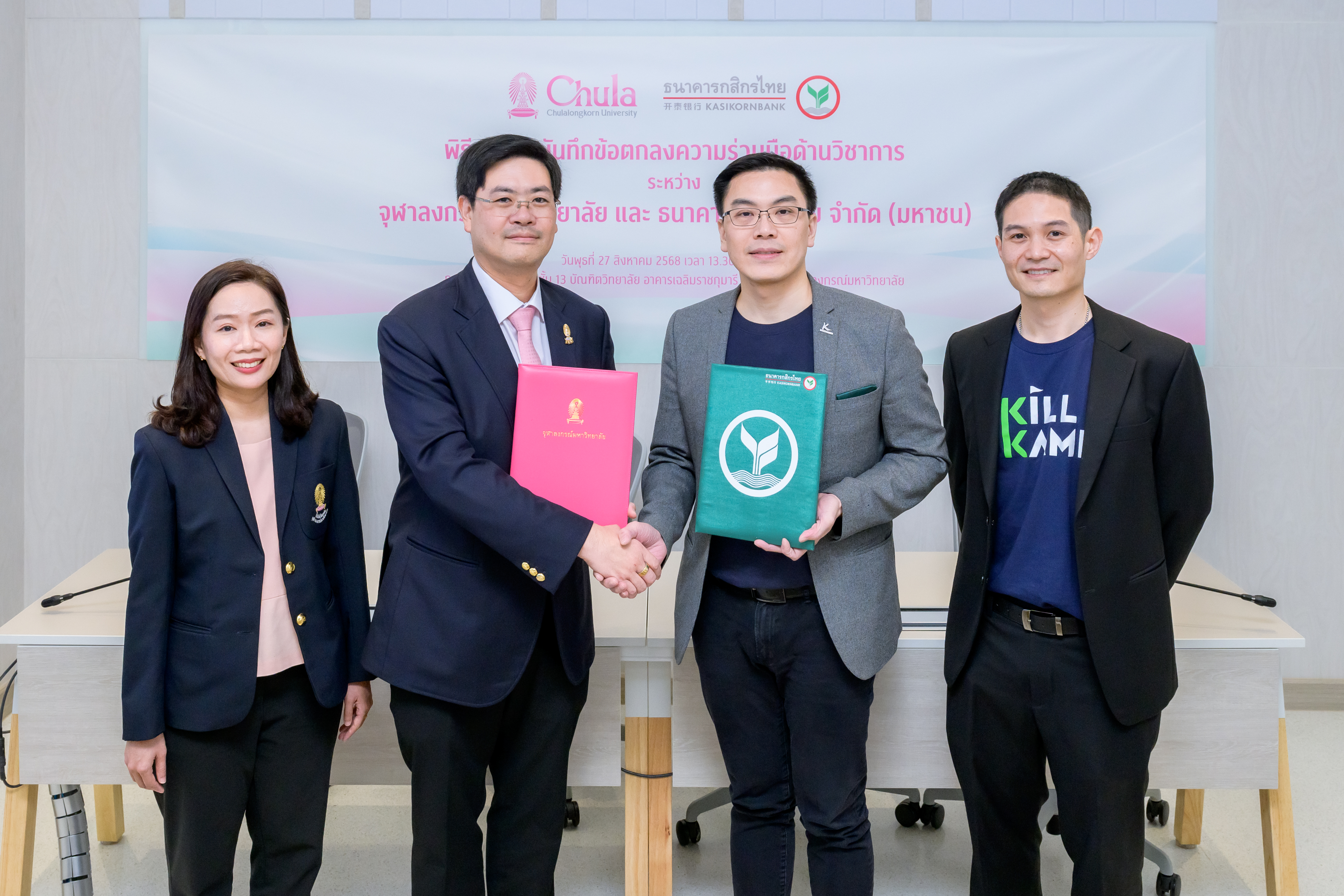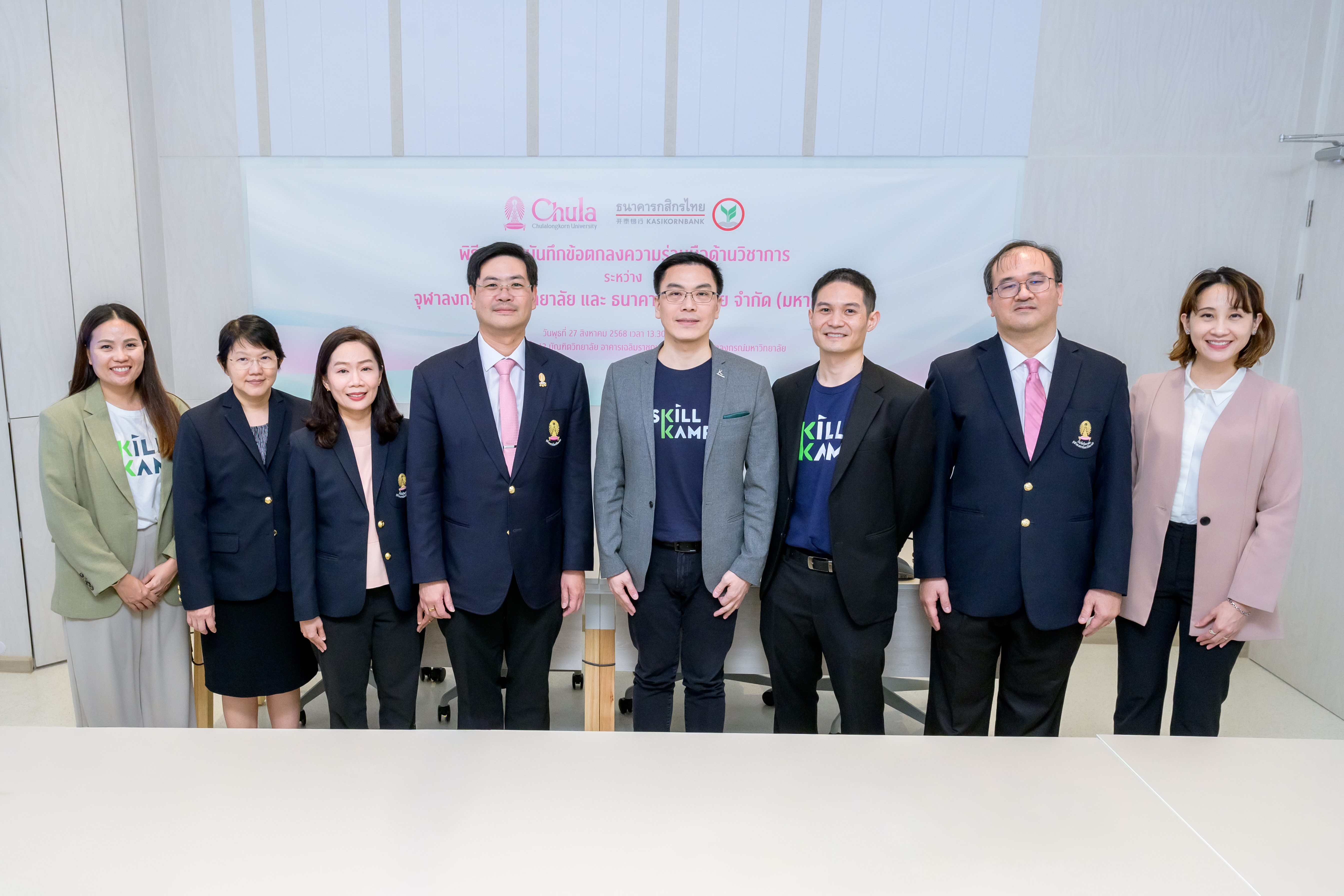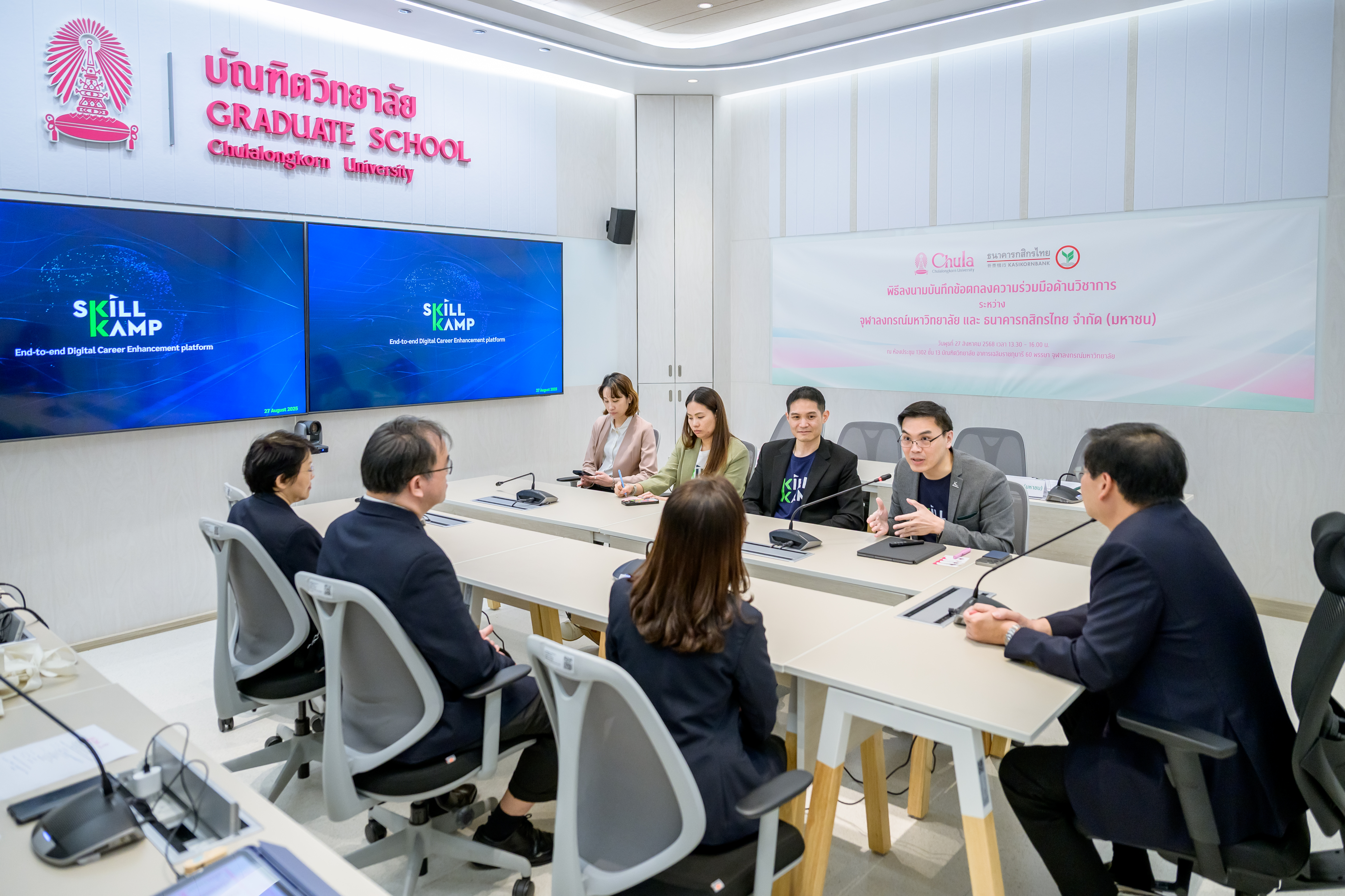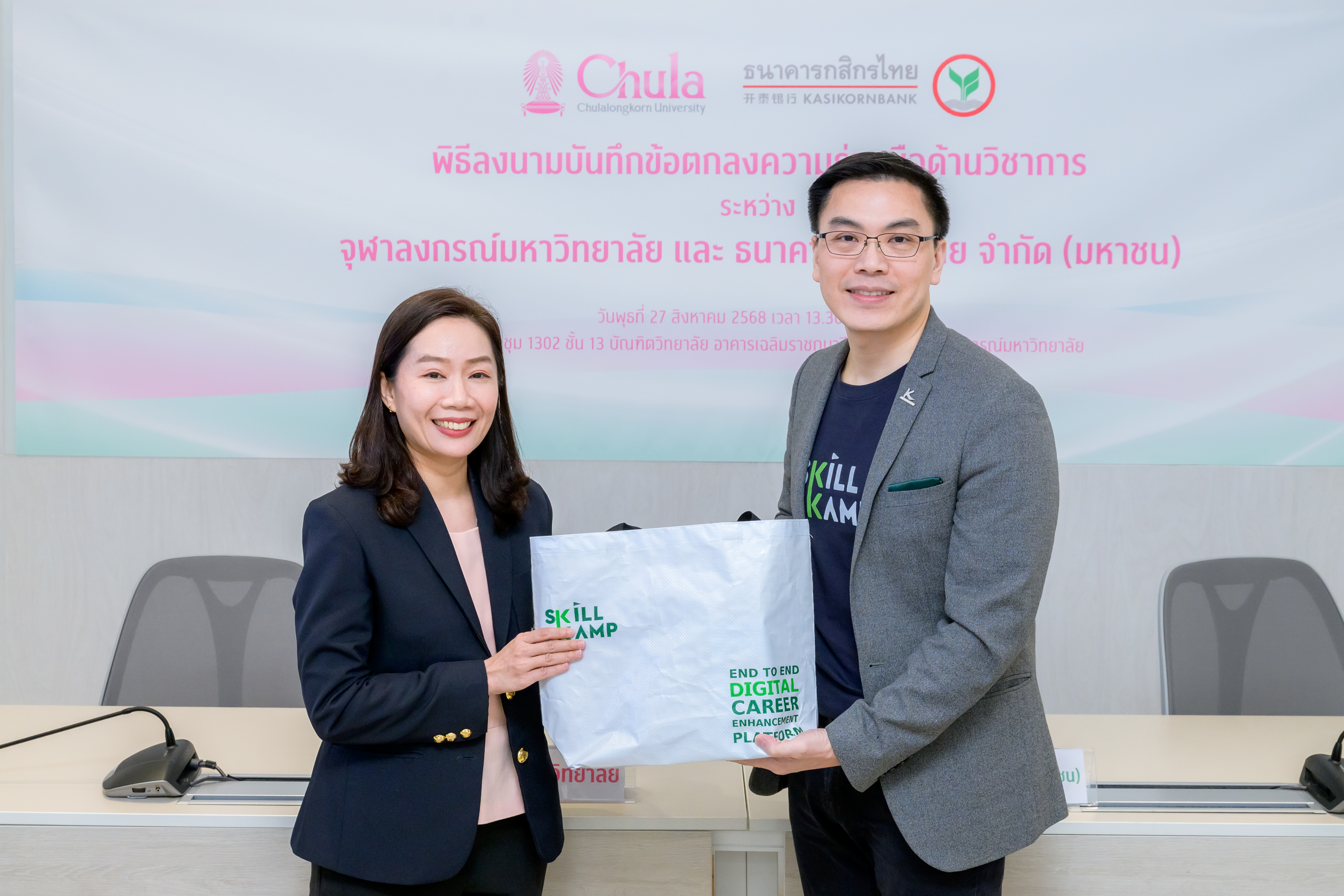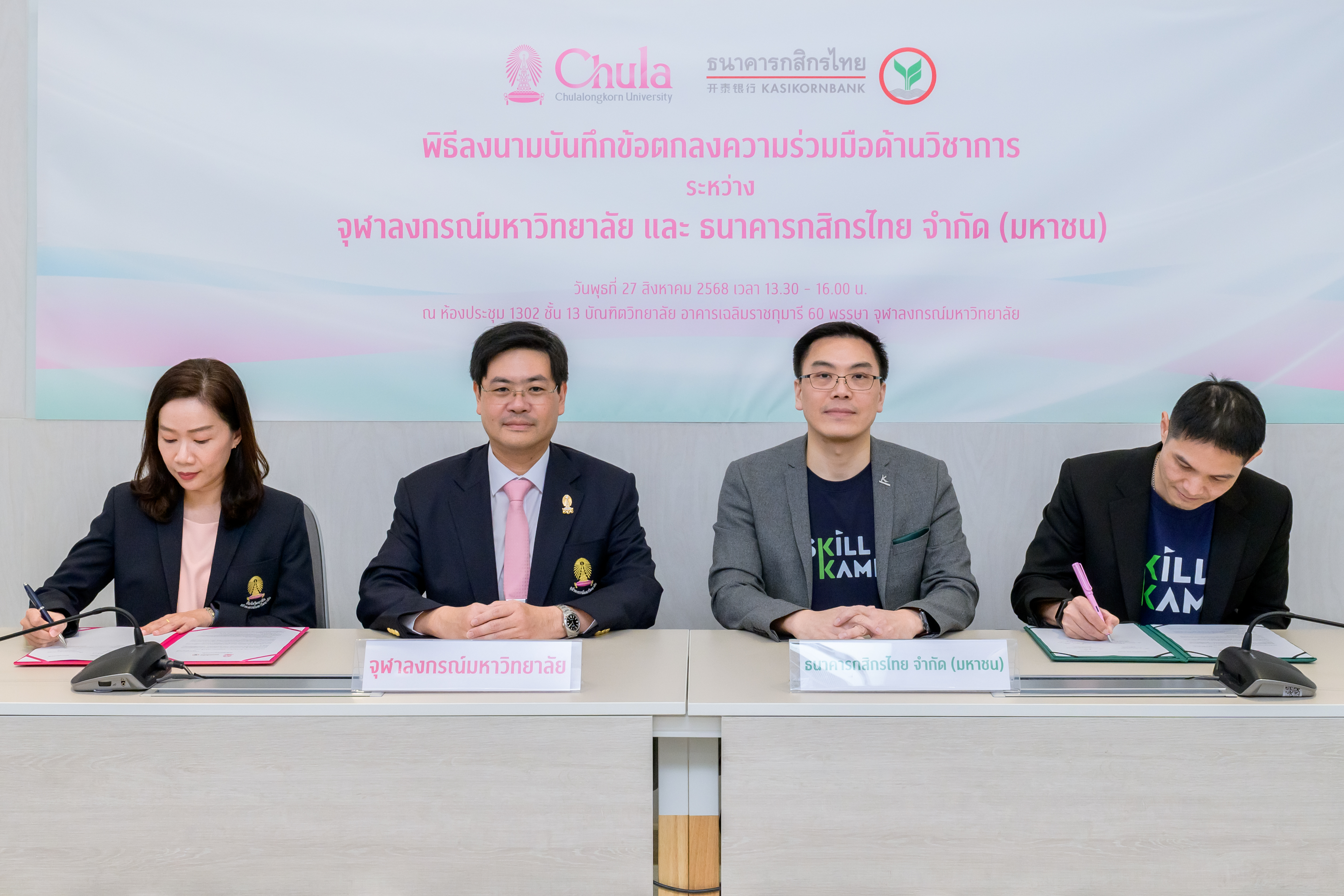 บัณฑิตวิทยาลัย จุฬาลงกรณ์มหาวิทยาลัย และธนาคารกสิกรไทย ร่วมลงนามบันทึกข้อตกลงความร่วมมือด้านวิชาการ (MOU) เชื่อมต่อแพลตฟอร์ม SKILLKAMP และ Chula Lifelong Learning (Chula X) เพื่อยกระดับศักยภาพการเรียนรู้และเปิดโอกาสให้ผู้เรียนสามารถเข้าถึงหลักสูตรคุณภาพที่อยู่บน 2 แพลตฟอร์ม รวมกว่า 1,000 รายวิชา ได้อย่างไร้รอยต่อ ครอบคลุมทั้งวิชาการและทักษะดิจิทัล รองรับการ Upskill-Reskill ทุกช่วงวัย โดยคาดหวังว่าความร่วมมือในครั้งนี้จะช่วยพัฒนาทักษะและสร้างบุคลากรที่มีศักยภาพเพิ่มมากขึ้น เพื่อร่วมกันขับเคลื่อนเศรษฐกิจไทยให้เติบโตไปได้อีก พร้อมเดินหน้าเปิดให้บริการเรียนรู้เต็มรูปแบบในปี 2569