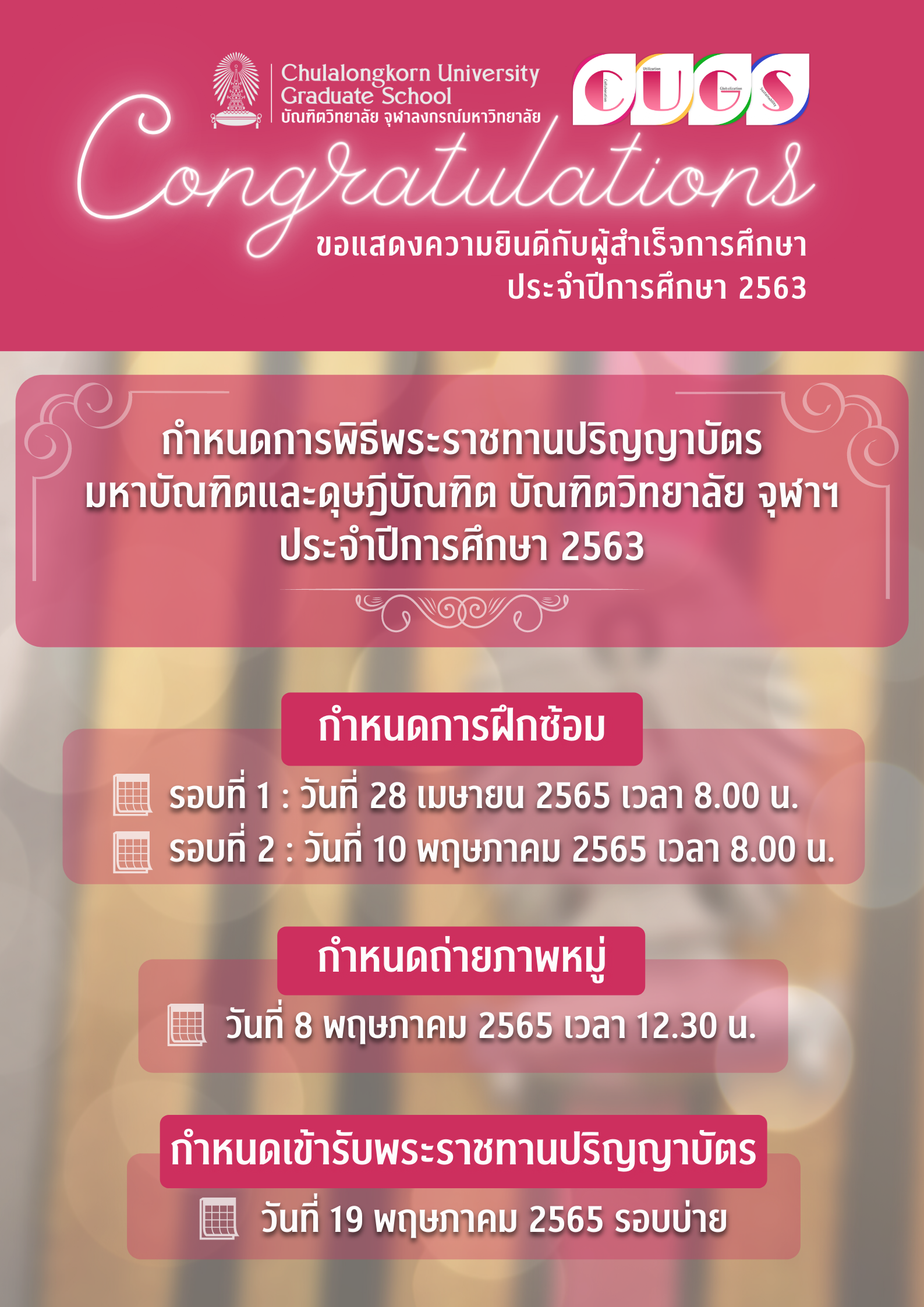 กำหนดการพิธีพระราชทานปริญญาบัตร มหาบัณฑิตและดุษฎีบัณฑิต บัณฑิตวิทยาลัย จุฬาฯ ประจำปีการศึกษา 2563
